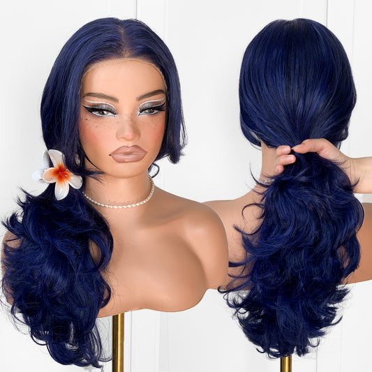MITIMES Dark Blue Voluminous Feather Layered Hair Flip Out Preplucked Precision-Precut-cut Ready-to-Go Glueless 13x6 HD Synthetic Lace Front Wig
