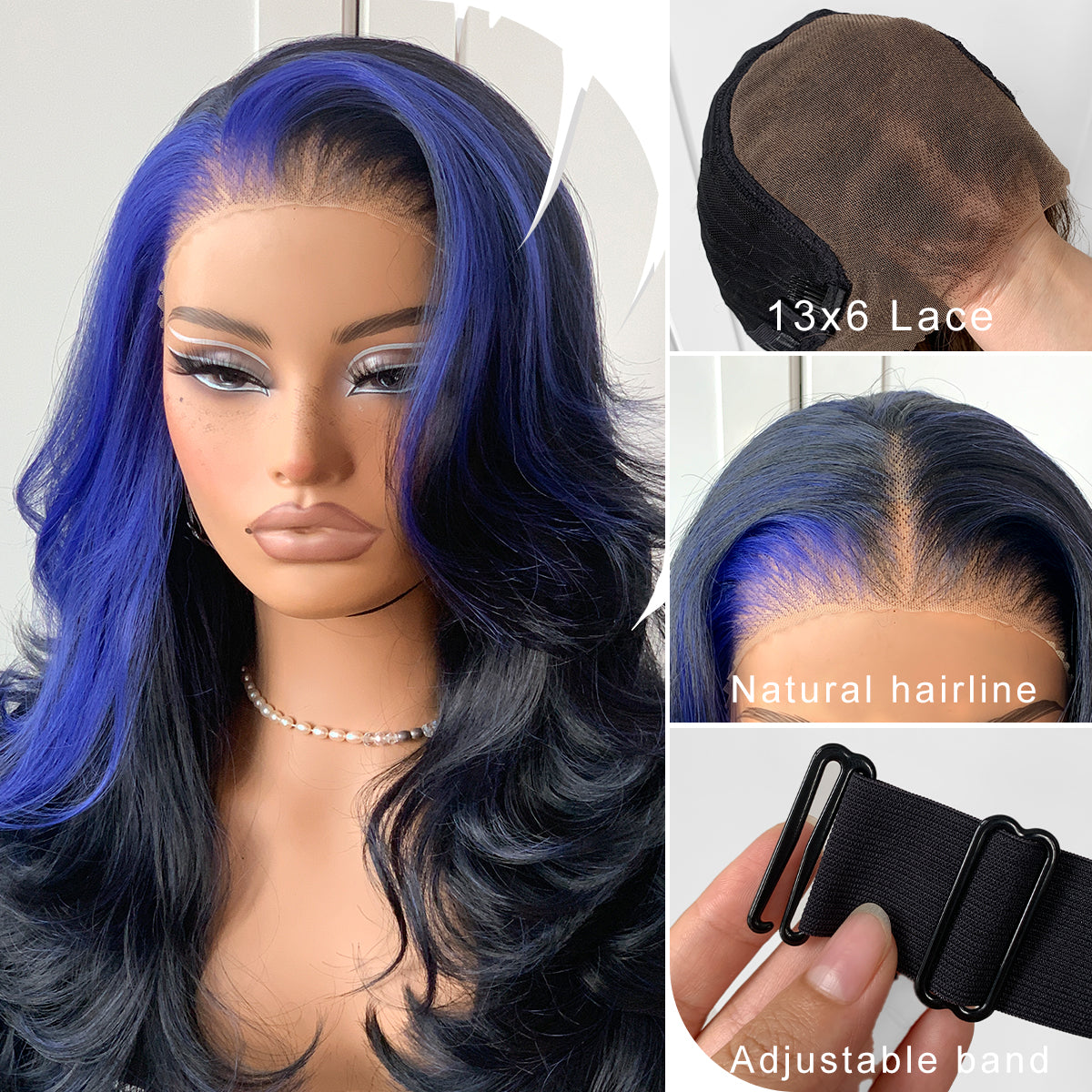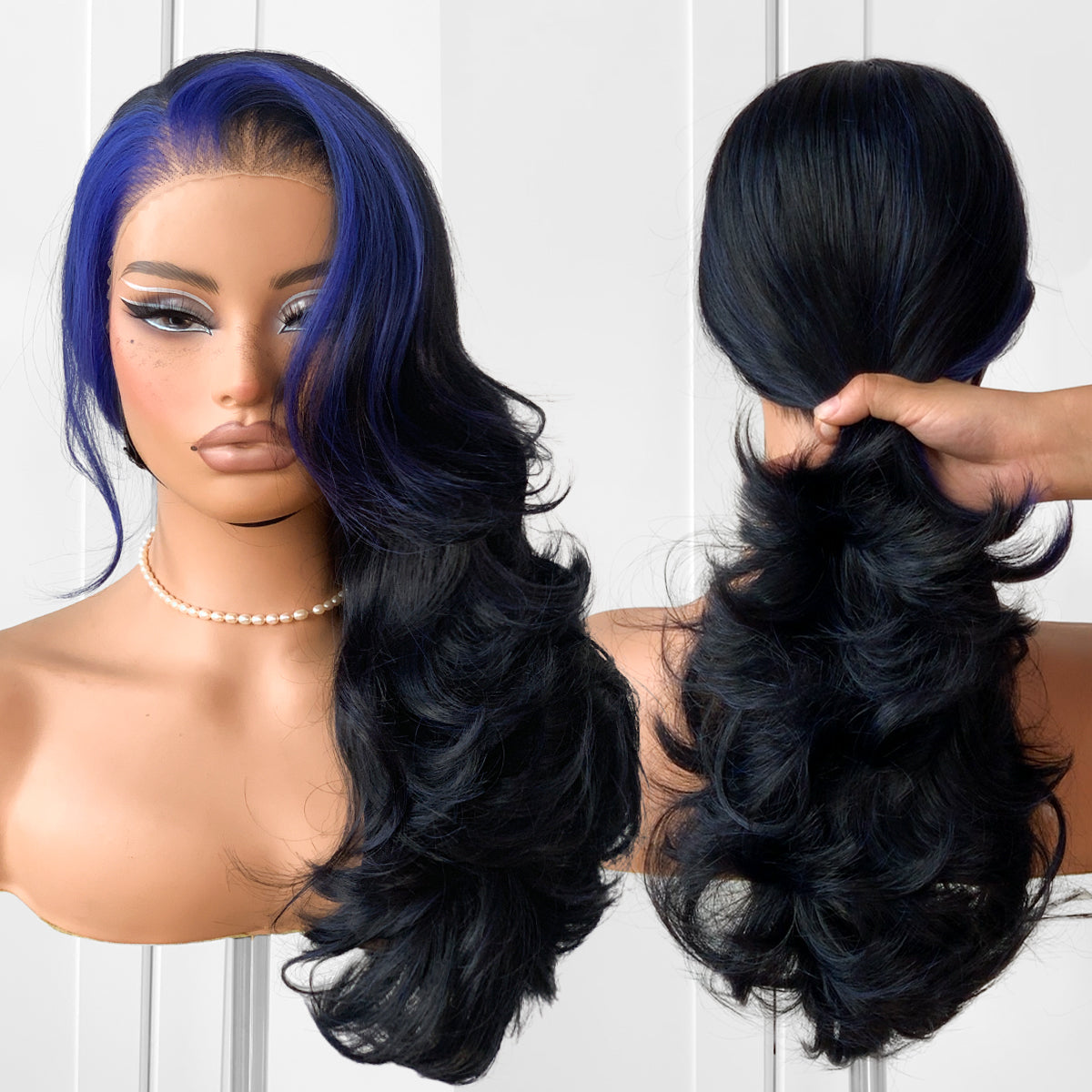 Feather Layered Hair Cuting Style Long 13x6 Synthetic Lace Front Wig Wear and Go Glueless Natural Hairline Blue Skunk Stripe Wig