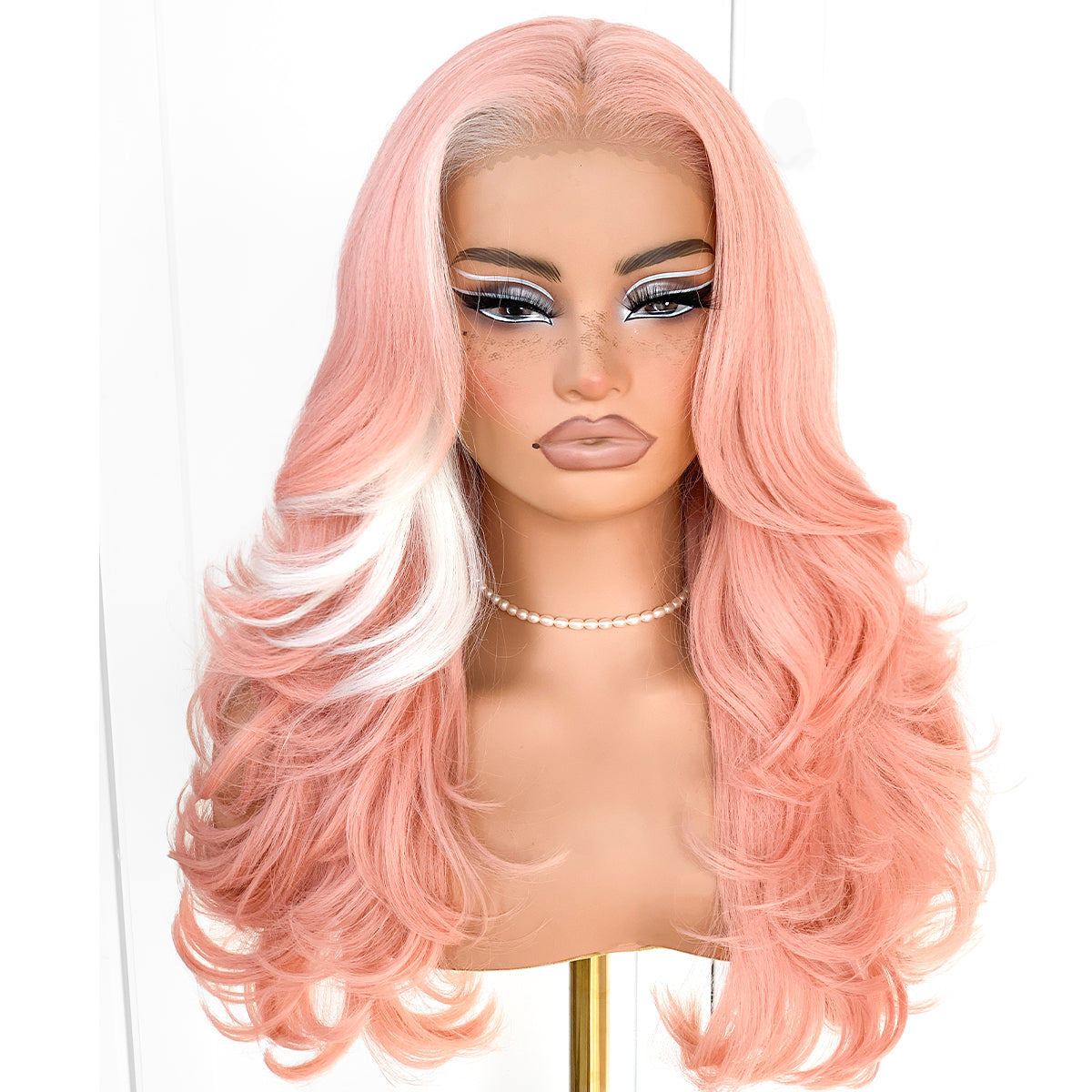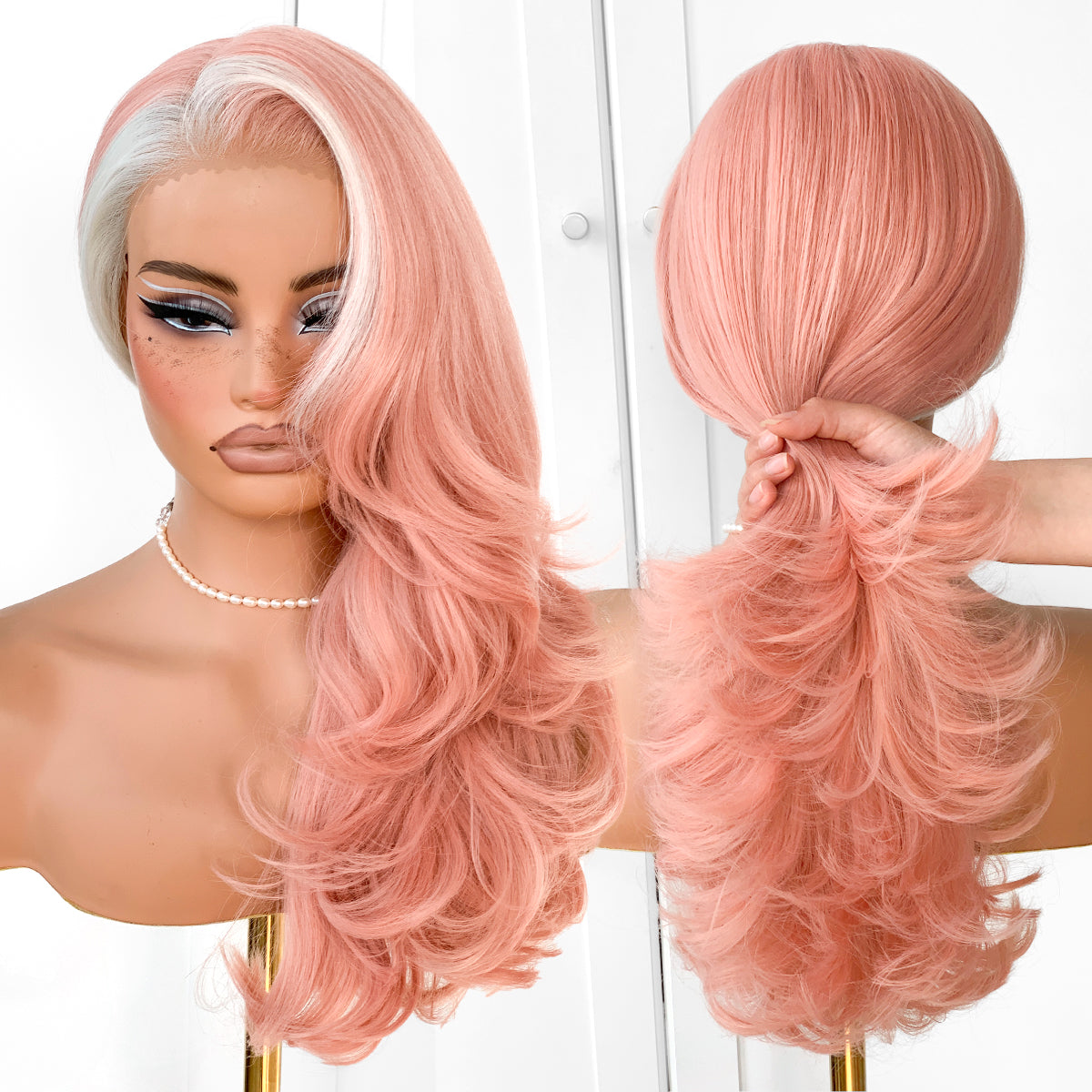 Feather Layered Hair Cuting Style Long 13x6 Synthetic Lace Front Wig Wear and Go Glueless Natural Hairline Pink Skunk Stripe Wig
