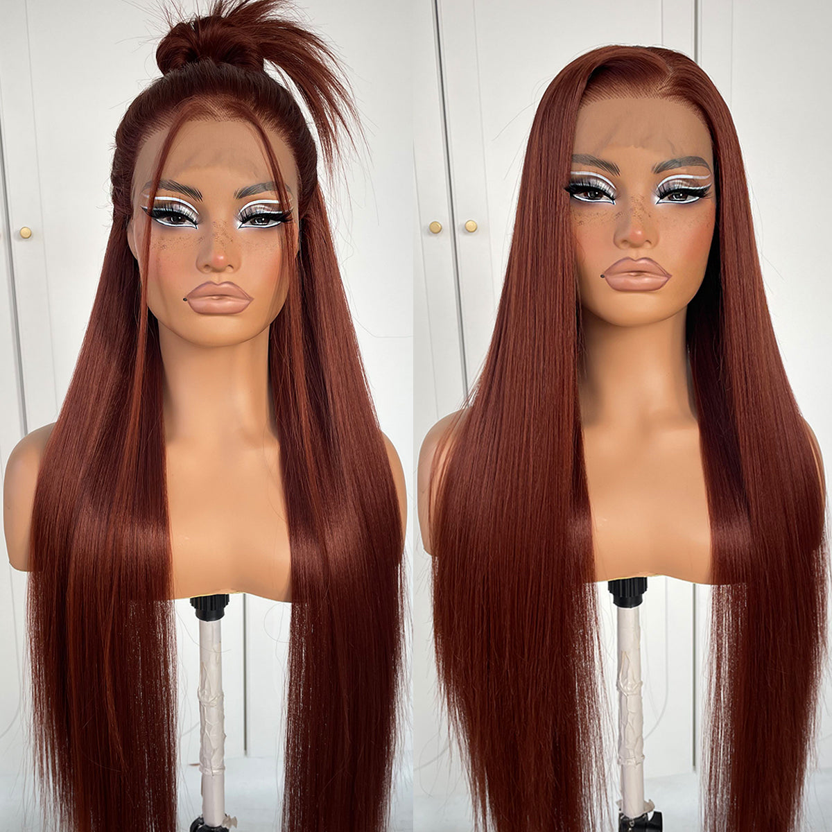 MITIMES 13x6 Reddish Brown Lace Front Wig Pre-Plucked Straight HD Lace Front Wig Glueless Synthetic Red Brown Long Straight Lace Front Wig 32inch
