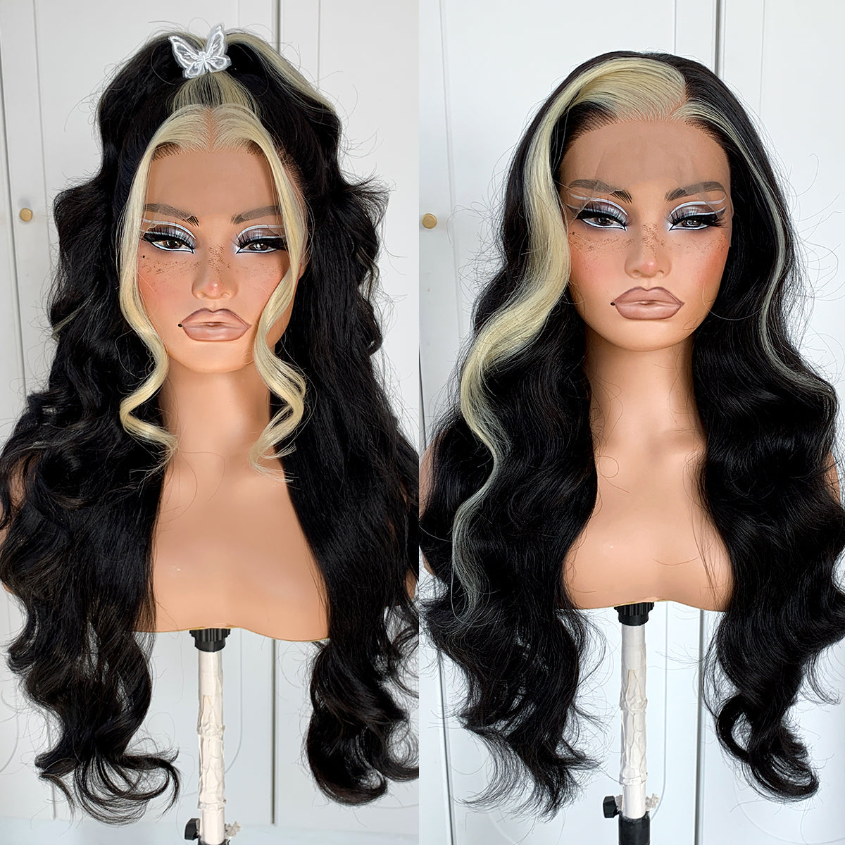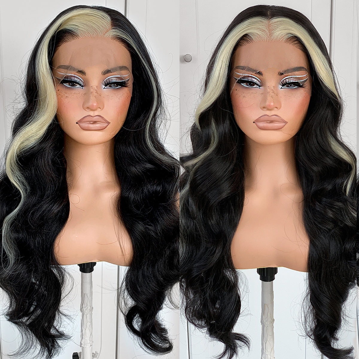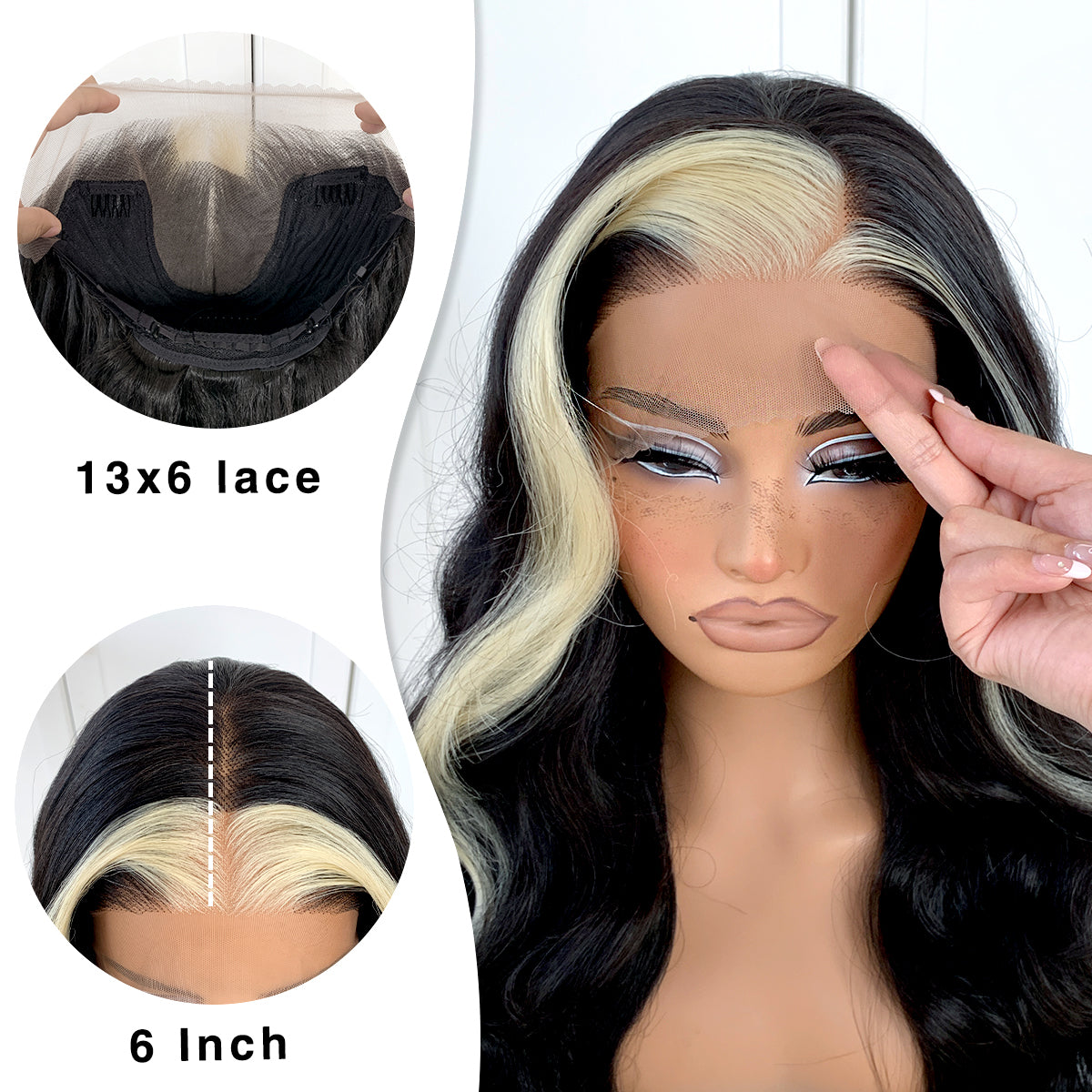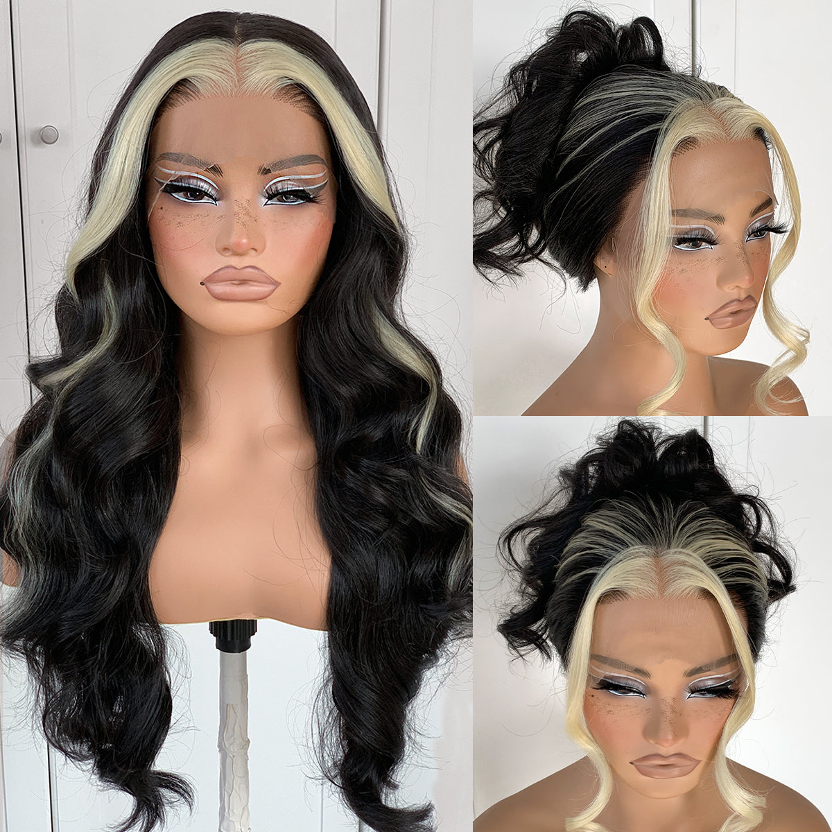 MITIMES 13x6 Skunk Stripe Wig Glueless Middle Skunk Stripe Body Wave Lace Front Wigs Pre Plucked Synthetic Long Highlights Wear and Go lace front wig